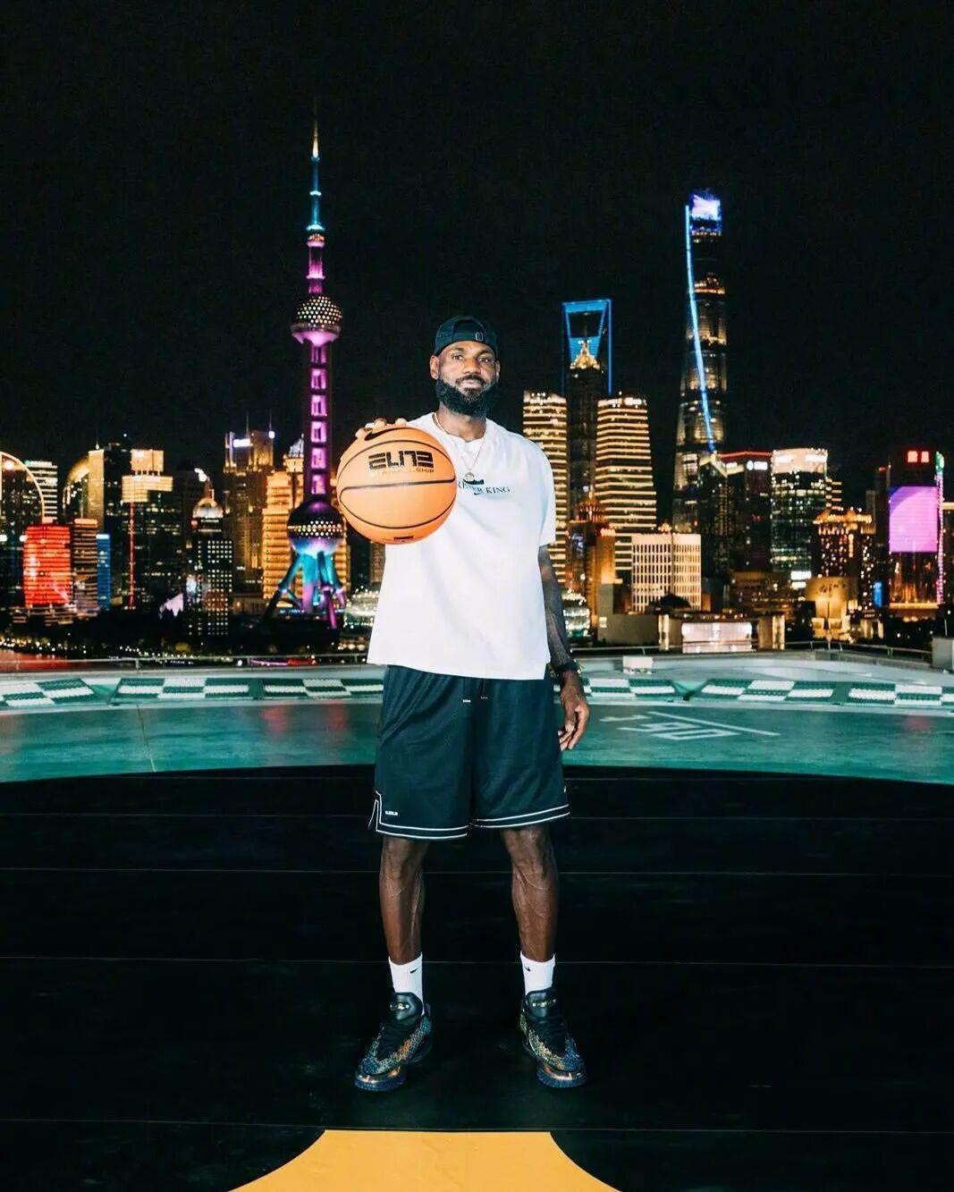 詹姆斯于9月3日晚现身上海外滩半岛酒店楼顶停机坪,打卡东方明珠塔夜景,拍摄宣传照。他身穿白色主题T恤,脚踩金色王冠设计的战靴,与璀璨的城市地标同框,象征“传奇加冕”之意。此次为中国行第15站,也是自2018年后时隔六年再度访华,被媒体视为可能的球员生涯收官之旅。另有球迷透露,詹姆斯曾在酒店健身房晨练,展现其高度自律的职业状态。