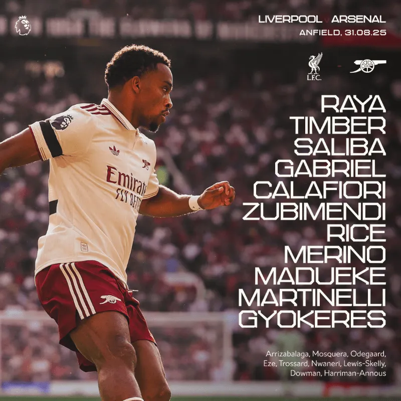 替补:凯帕、莫斯克拉、厄德高、埃泽、特罗萨德、恩瓦内里、刘易斯-斯凯利、道曼、哈里曼-阿努斯。